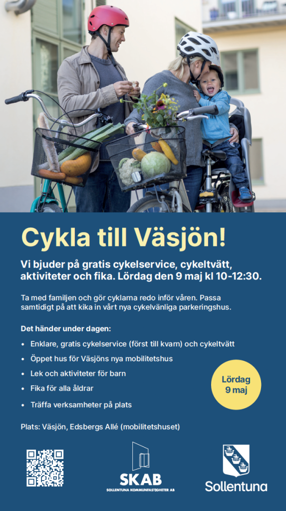 Lördag den 9 maj kl. 10–12.30 är det dags för en förmiddag i Väsjön med fokus på cykel, rörelse och möten. På plats vid mobilitetshuset på Edsbergs allé erbjuds enklare gratis cykelservice (först till kvarn) och cykeltvätt, perfekt inför vårsäsongen.